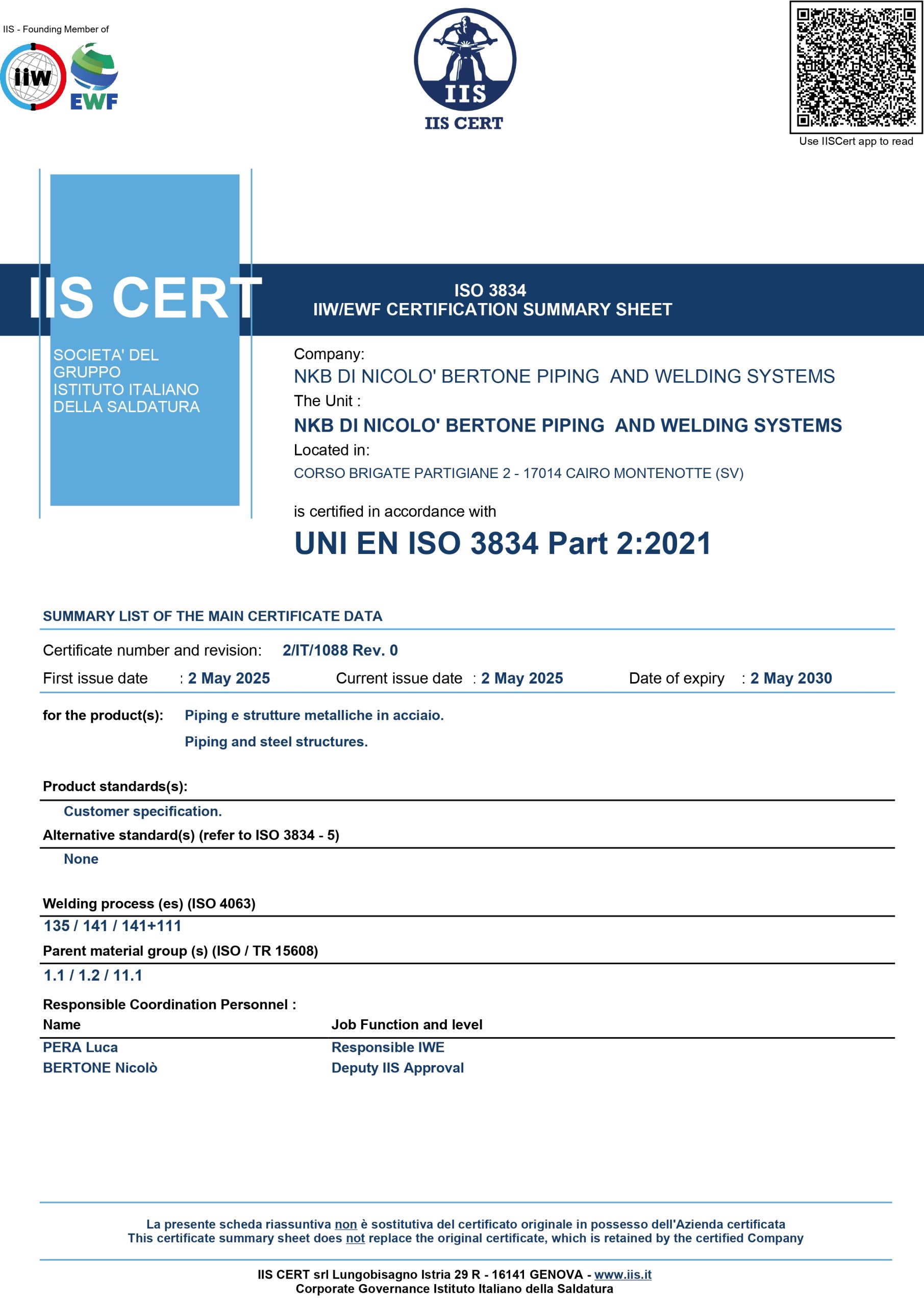 La società si avvale di saldatori certificati in accordo alla Norma UNI EN ISO 9606-1 e di procedure certificate in accordo alla Norma UNI EN ISO 15614 1, abbiamo inoltre conseguito ad aprile 2025 la certificazione in accordo alla UNI EN ISO 3834-2 dall’istituto italiano della saldatura (IIS CERT). Con orgoglio, presentiamo la nostra azienda, con officina per le lavorazioni di proprietà e forte di un solido background caratterizzato da successi e risultati